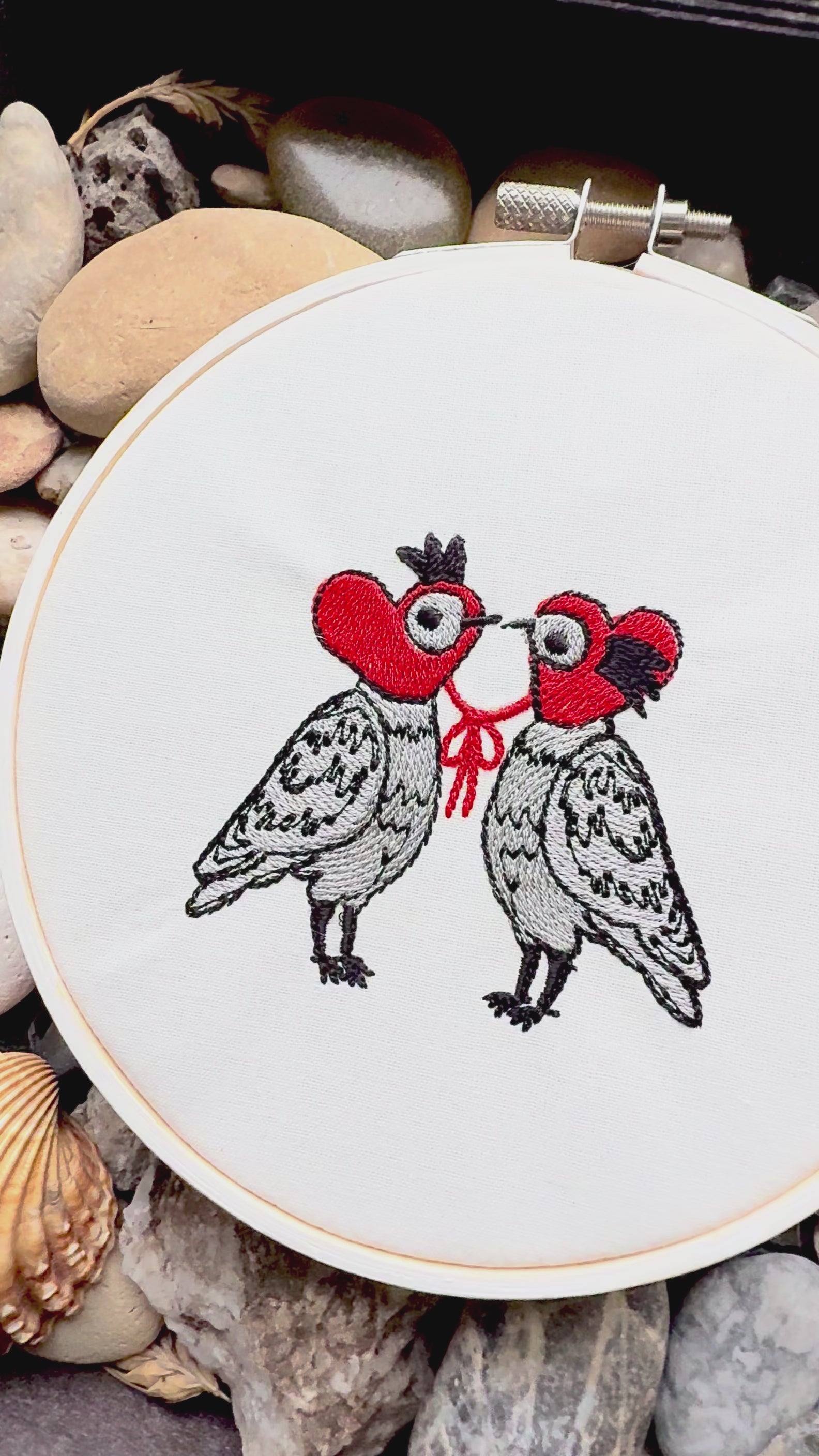 This digital machine embroidery design features two cartoon-style doves wearing knitted heart-shaped hats, tied together with a delicate red bow. The playful details and modern aesthetic create a whimsical and romantic look that feels both lighthearted and meaningful. Perfectly balanced stitching brings the unique charm of this design to life, making it ideal for creative embroidery projects.