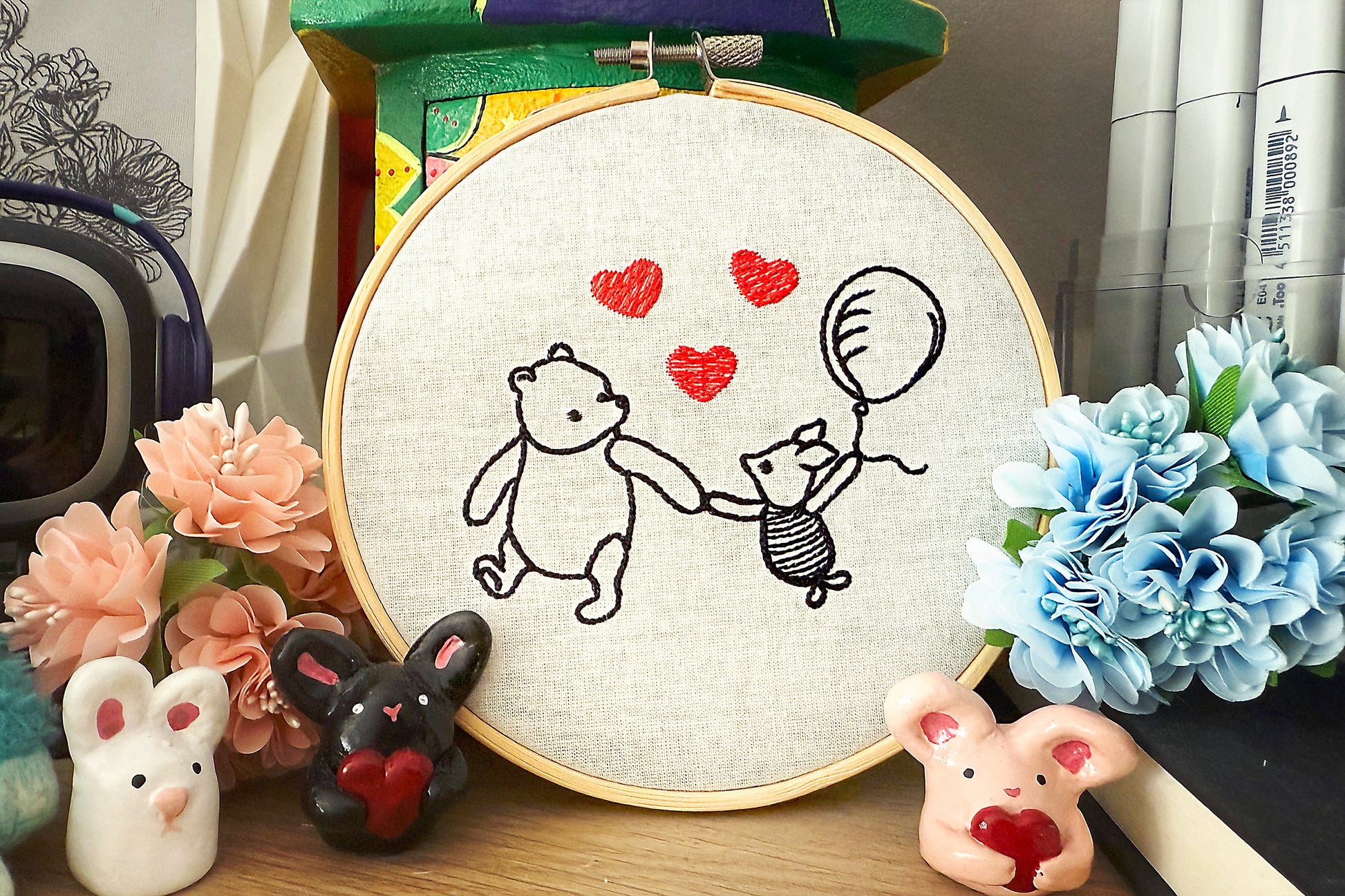 Bring a smile to your day with this sweet and simple embroidery design featuring Winnie the Pooh and Piglet holding hands, with hearts floating above. Perfect for a quick stitch or a thoughtful gift!